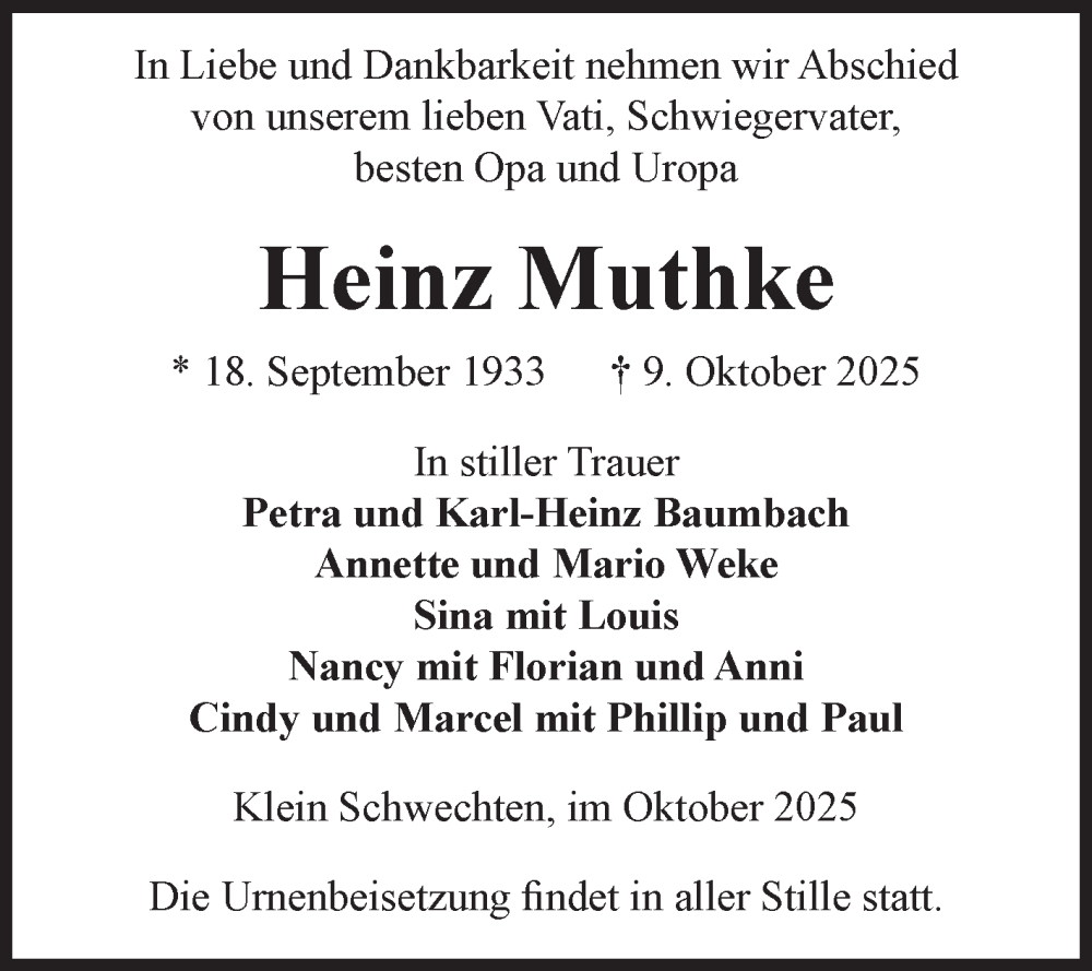 Hier finden Sie alle Traueranzeigen aus der Zeitung, die bisher für Heinz Muthke erschienen sind. Weitere Traueranzeigen, die in der Zeitung erscheinen, werden hier ebenfalls aufgelistet