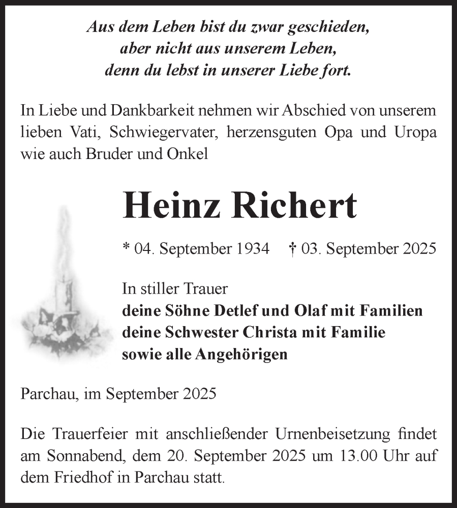 Hier finden Sie alle Traueranzeigen aus der Zeitung, die bisher für Heinz Richert erschienen sind. Weitere Traueranzeigen, die in der Zeitung erscheinen, werden hier ebenfalls aufgelistet