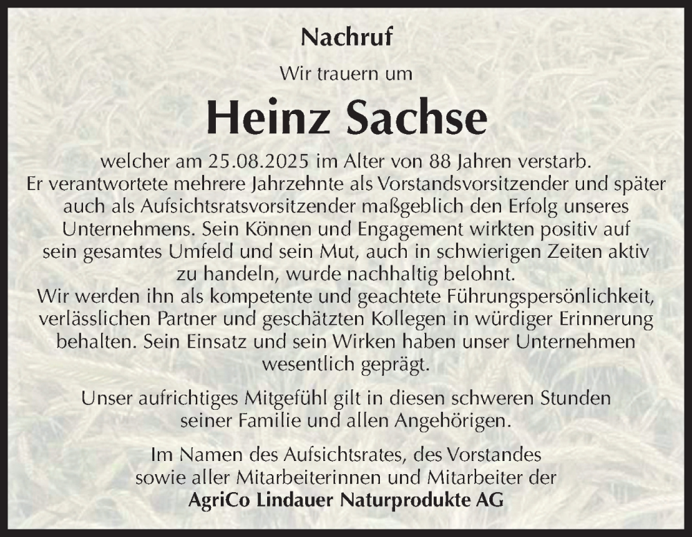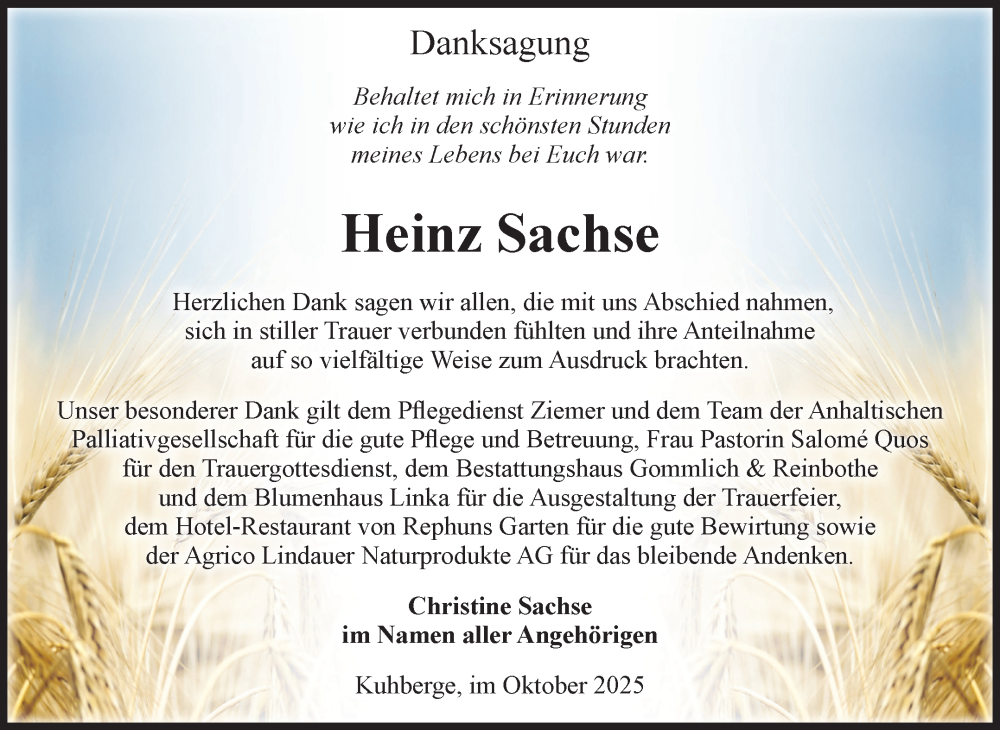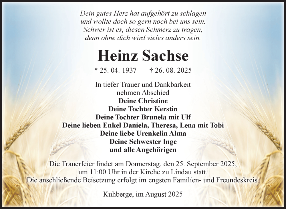 Hier finden Sie alle Traueranzeigen aus der Zeitung, die bisher für Heinz Sachse erschienen sind. Weitere Traueranzeigen, die in der Zeitung erscheinen, werden hier ebenfalls aufgelistet