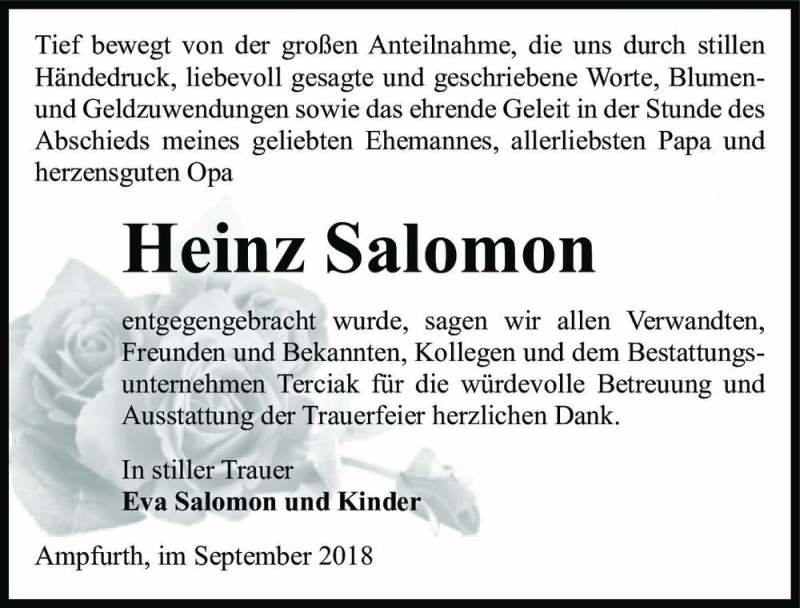Hier finden Sie alle Traueranzeigen aus der Zeitung, die bisher für Heinz Salomon erschienen sind. Weitere Traueranzeigen, die in der Zeitung erscheinen, werden hier ebenfalls aufgelistet