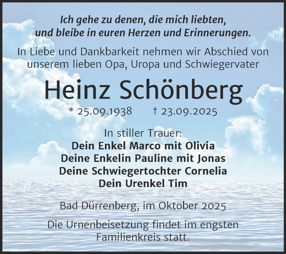 Hier finden Sie alle Traueranzeigen aus der Zeitung, die bisher für Heinz Schönberg erschienen sind. Weitere Traueranzeigen, die in der Zeitung erscheinen, werden hier ebenfalls aufgelistet