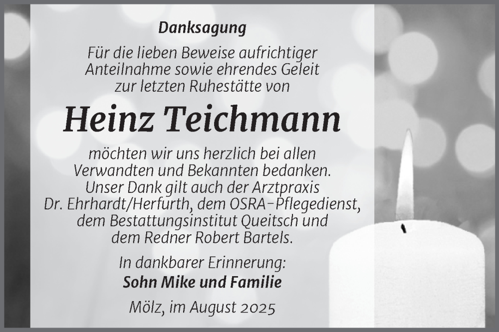 Hier finden Sie alle Traueranzeigen aus der Zeitung, die bisher für Heinz Teichmann erschienen sind. Weitere Traueranzeigen, die in der Zeitung erscheinen, werden hier ebenfalls aufgelistet