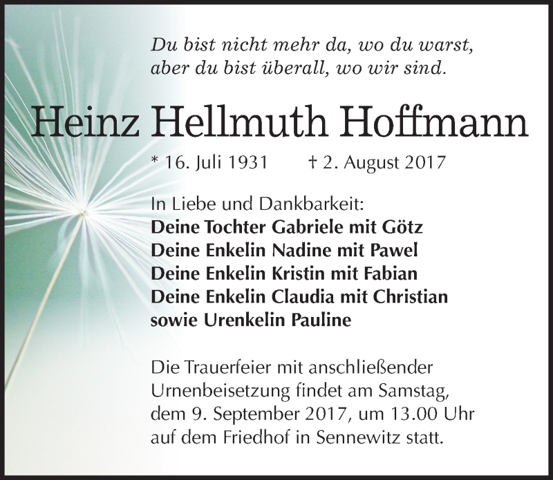 Hier finden Sie alle Traueranzeigen aus der Zeitung, die bisher für Heinz Hellmuth Hoffmann erschienen sind. Weitere Traueranzeigen, die in der Zeitung erscheinen, werden hier ebenfalls aufgelistet