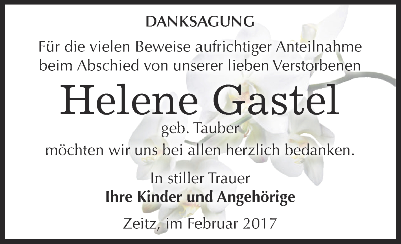 Hier finden Sie alle Traueranzeigen aus der Zeitung, die bisher für Helene Gastel erschienen sind. Weitere Traueranzeigen, die in der Zeitung erscheinen, werden hier ebenfalls aufgelistet