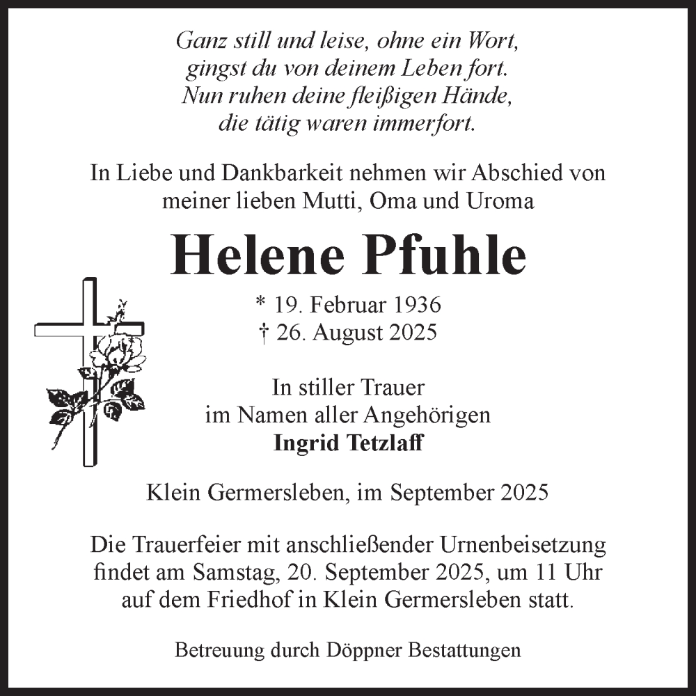 Hier finden Sie alle Traueranzeigen aus der Zeitung, die bisher für Helene Pfuhle erschienen sind. Weitere Traueranzeigen, die in der Zeitung erscheinen, werden hier ebenfalls aufgelistet