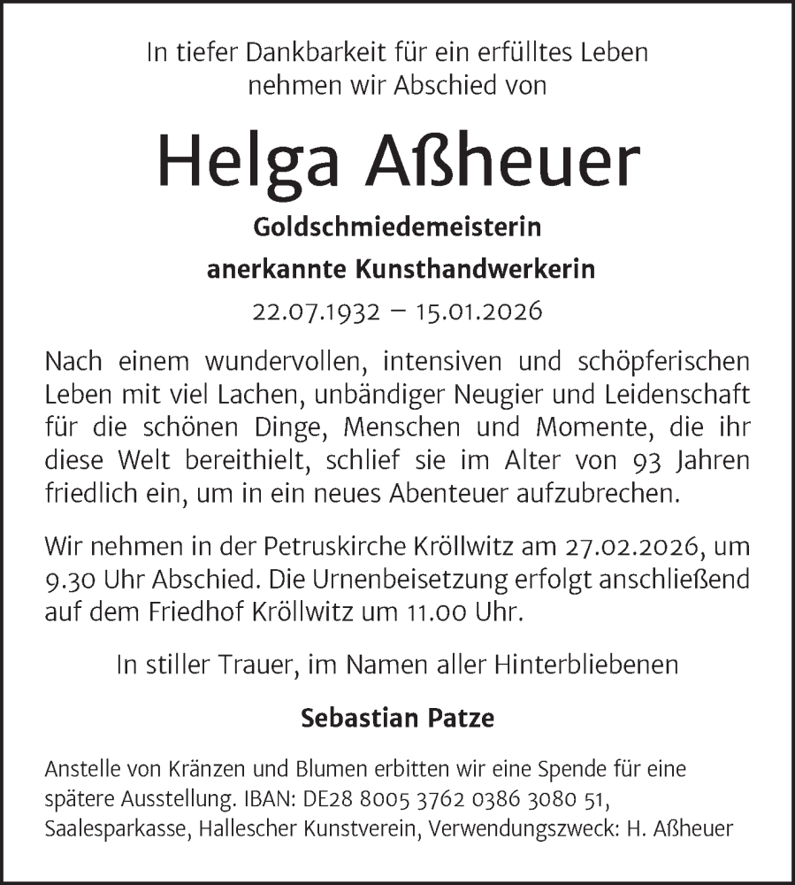 Hier finden Sie alle Traueranzeigen aus der Zeitung, die bisher für Helga Aßheuer erschienen sind. Weitere Traueranzeigen, die in der Zeitung erscheinen, werden hier ebenfalls aufgelistet