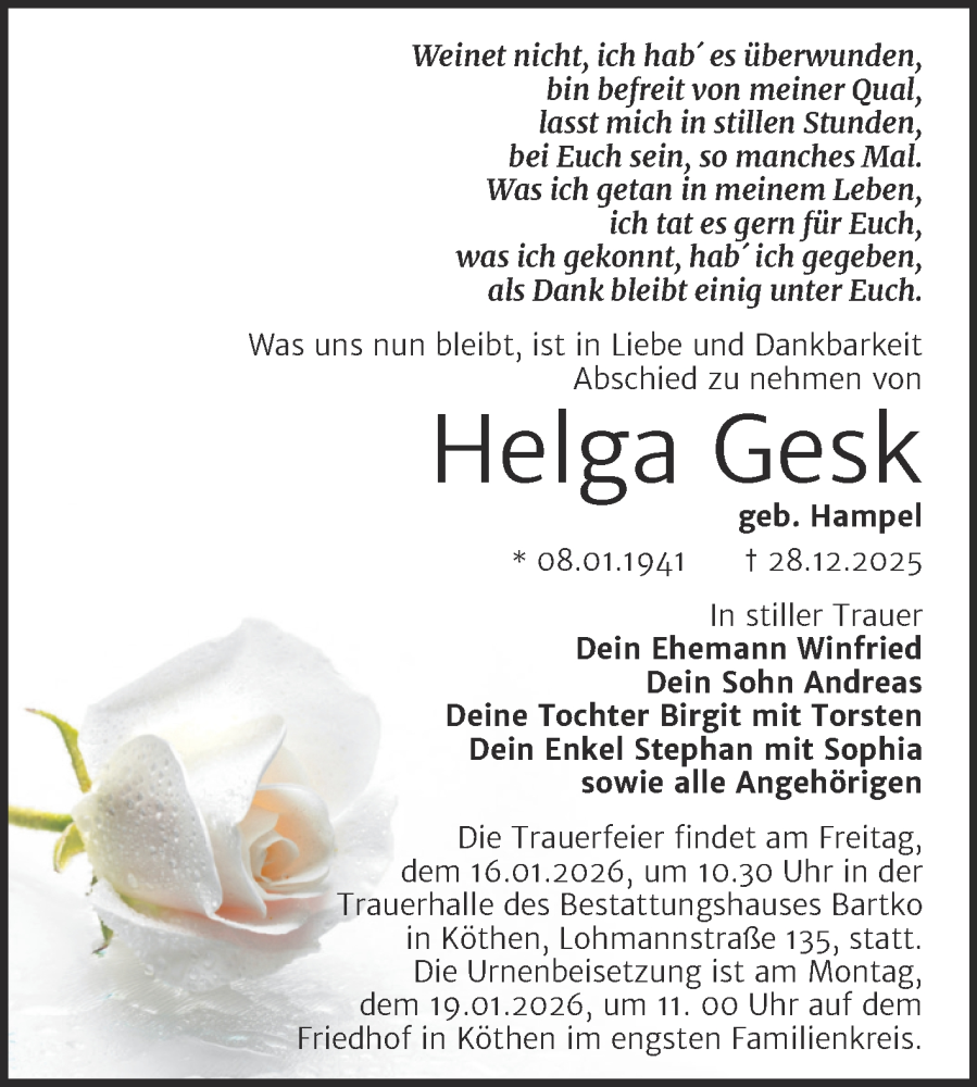 Hier finden Sie alle Traueranzeigen aus der Zeitung, die bisher für Helga Gesk erschienen sind. Weitere Traueranzeigen, die in der Zeitung erscheinen, werden hier ebenfalls aufgelistet
