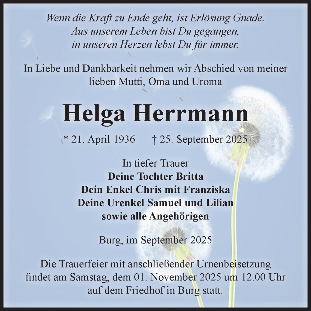 Hier finden Sie alle Traueranzeigen aus der Zeitung, die bisher für Helga Herrmann erschienen sind. Weitere Traueranzeigen, die in der Zeitung erscheinen, werden hier ebenfalls aufgelistet