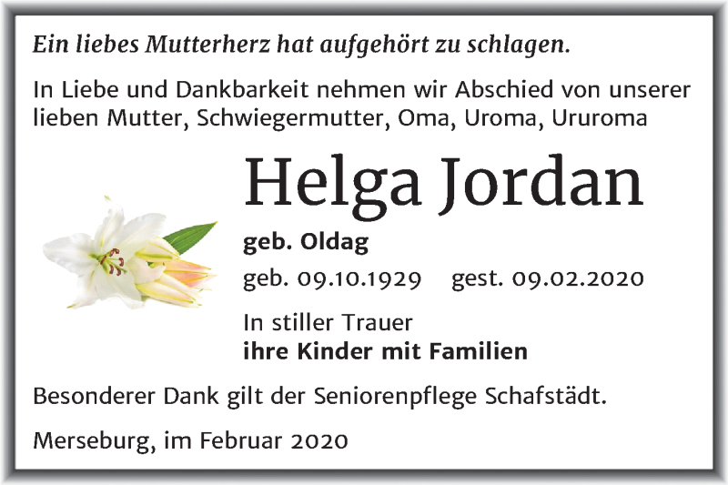 Hier finden Sie alle Traueranzeigen aus der Zeitung, die bisher für Helga Jordan erschienen sind. Weitere Traueranzeigen, die in der Zeitung erscheinen, werden hier ebenfalls aufgelistet