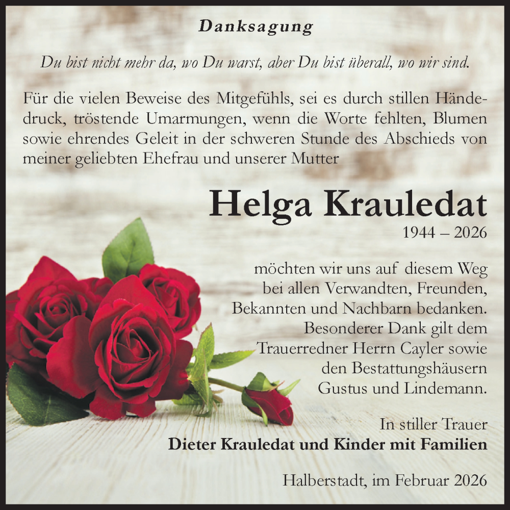Hier finden Sie alle Traueranzeigen aus der Zeitung, die bisher für Helga Krauledat erschienen sind. Weitere Traueranzeigen, die in der Zeitung erscheinen, werden hier ebenfalls aufgelistet