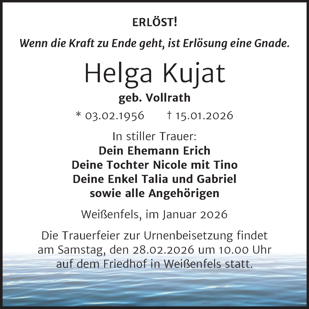 Hier finden Sie alle Traueranzeigen aus der Zeitung, die bisher für Helga Kujat erschienen sind. Weitere Traueranzeigen, die in der Zeitung erscheinen, werden hier ebenfalls aufgelistet