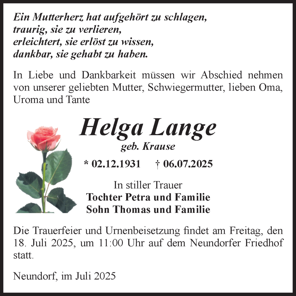 Hier finden Sie alle Traueranzeigen aus der Zeitung, die bisher für Helga Lange erschienen sind. Weitere Traueranzeigen, die in der Zeitung erscheinen, werden hier ebenfalls aufgelistet