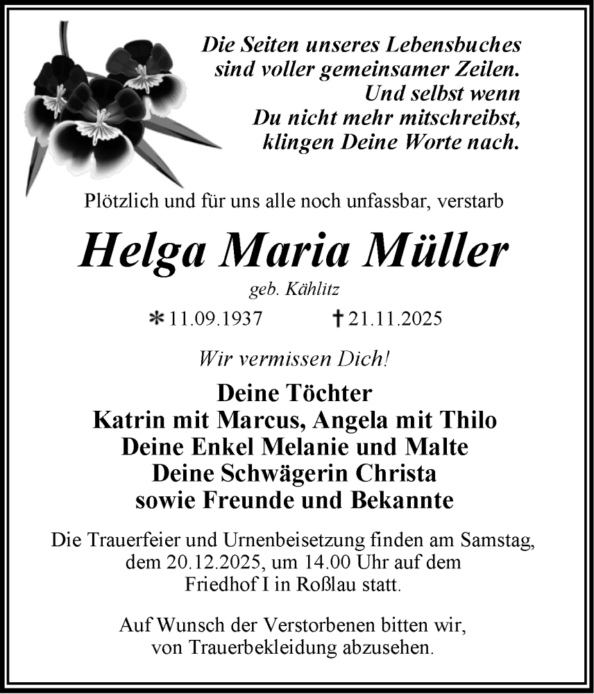 Hier finden Sie alle Traueranzeigen aus der Zeitung, die bisher für Helga Maria Müller erschienen sind. Weitere Traueranzeigen, die in der Zeitung erscheinen, werden hier ebenfalls aufgelistet