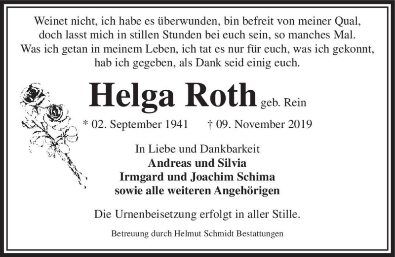 Hier finden Sie alle Traueranzeigen aus der Zeitung, die bisher für Helga Roth (geb. Rein) erschienen sind. Weitere Traueranzeigen, die in der Zeitung erscheinen, werden hier ebenfalls aufgelistet