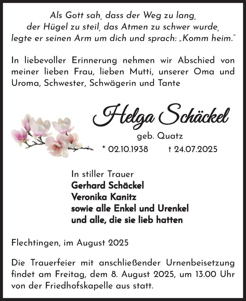 Hier finden Sie alle Traueranzeigen aus der Zeitung, die bisher für Helga Schäckel erschienen sind. Weitere Traueranzeigen, die in der Zeitung erscheinen, werden hier ebenfalls aufgelistet