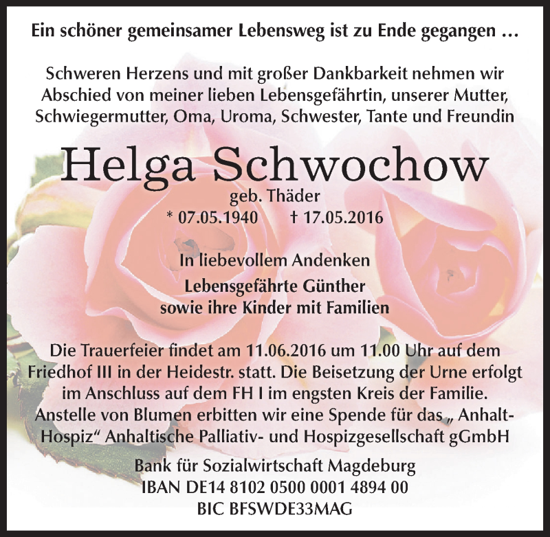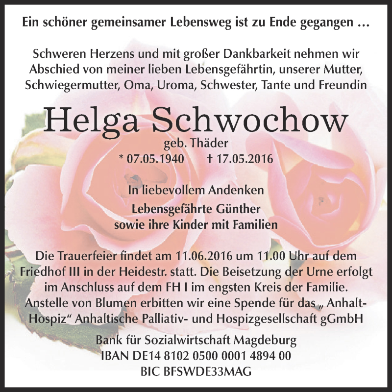 Hier finden Sie alle Traueranzeigen aus der Zeitung, die bisher für Helga Schwochow erschienen sind. Weitere Traueranzeigen, die in der Zeitung erscheinen, werden hier ebenfalls aufgelistet