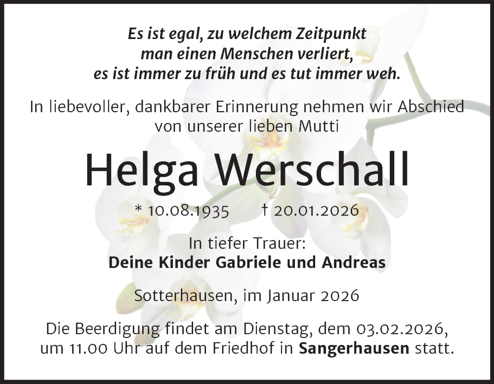 Hier finden Sie alle Traueranzeigen aus der Zeitung, die bisher für Helga Werschall erschienen sind. Weitere Traueranzeigen, die in der Zeitung erscheinen, werden hier ebenfalls aufgelistet