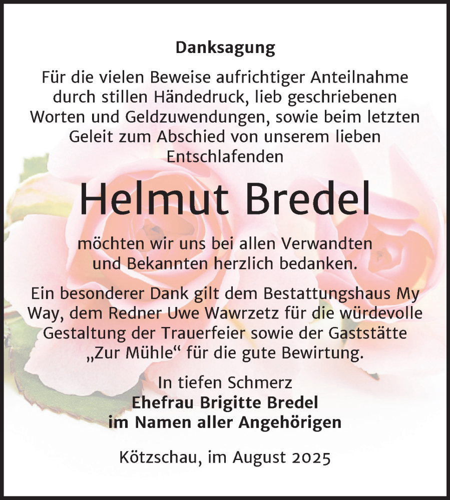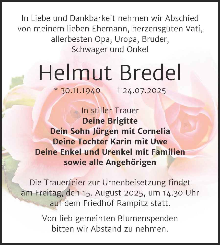 Hier finden Sie alle Traueranzeigen aus der Zeitung, die bisher für Helmut Bredel erschienen sind. Weitere Traueranzeigen, die in der Zeitung erscheinen, werden hier ebenfalls aufgelistet