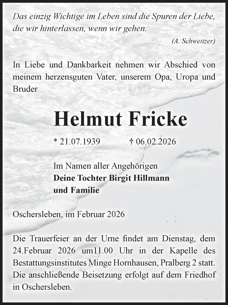 Hier finden Sie alle Traueranzeigen aus der Zeitung, die bisher für Helmut Fricke erschienen sind. Weitere Traueranzeigen, die in der Zeitung erscheinen, werden hier ebenfalls aufgelistet