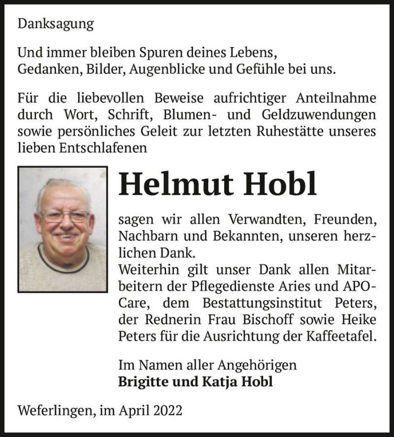 Hier finden Sie alle Traueranzeigen aus der Zeitung, die bisher für Helmut Hobl erschienen sind. Weitere Traueranzeigen, die in der Zeitung erscheinen, werden hier ebenfalls aufgelistet