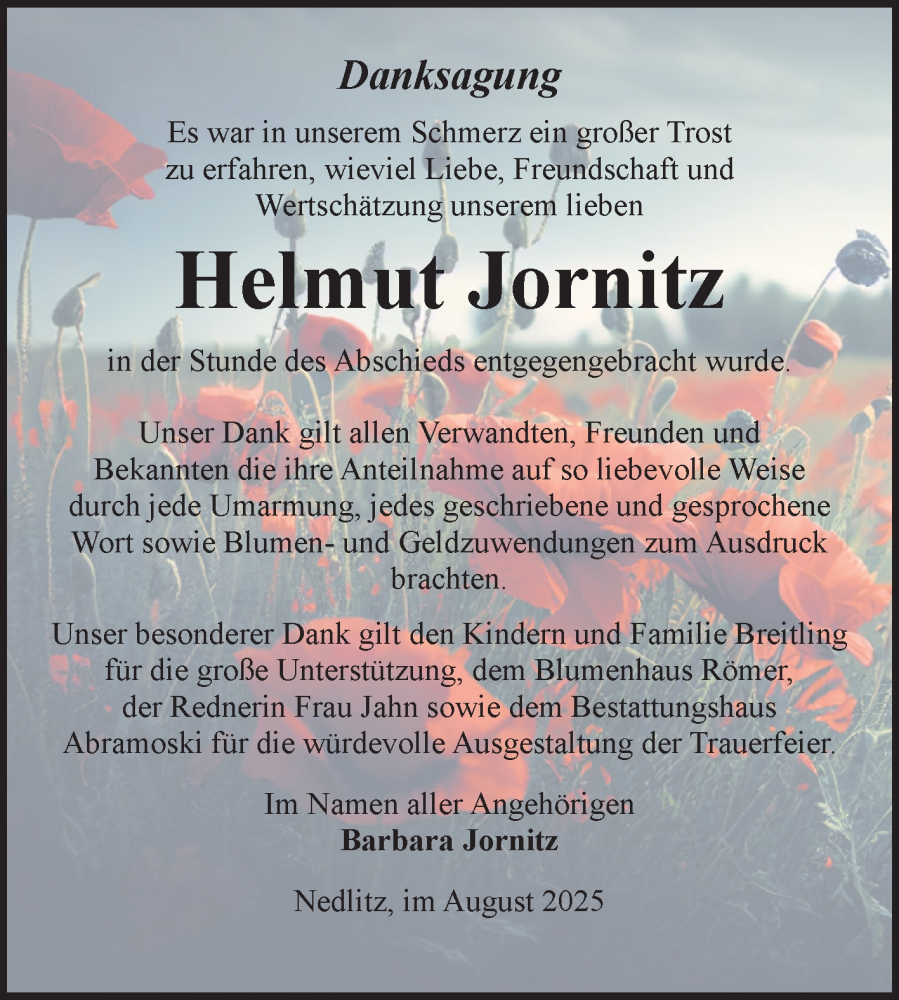 Hier finden Sie alle Traueranzeigen aus der Zeitung, die bisher für Helmut Jornitz erschienen sind. Weitere Traueranzeigen, die in der Zeitung erscheinen, werden hier ebenfalls aufgelistet