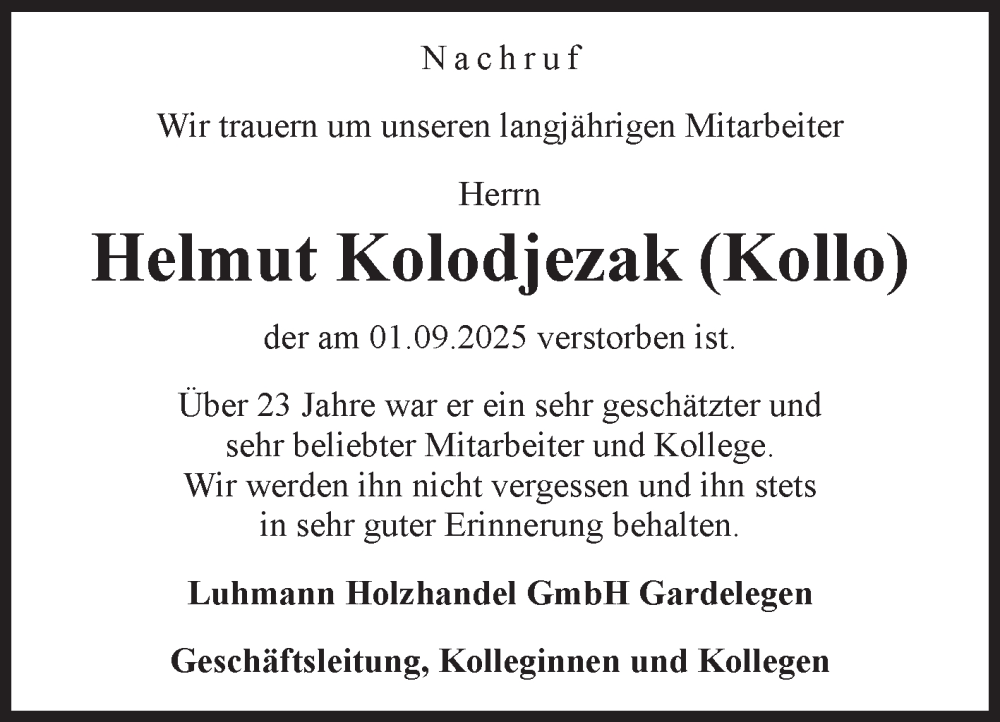 Hier finden Sie alle Traueranzeigen aus der Zeitung, die bisher für Helmut Kolodjezak erschienen sind. Weitere Traueranzeigen, die in der Zeitung erscheinen, werden hier ebenfalls aufgelistet