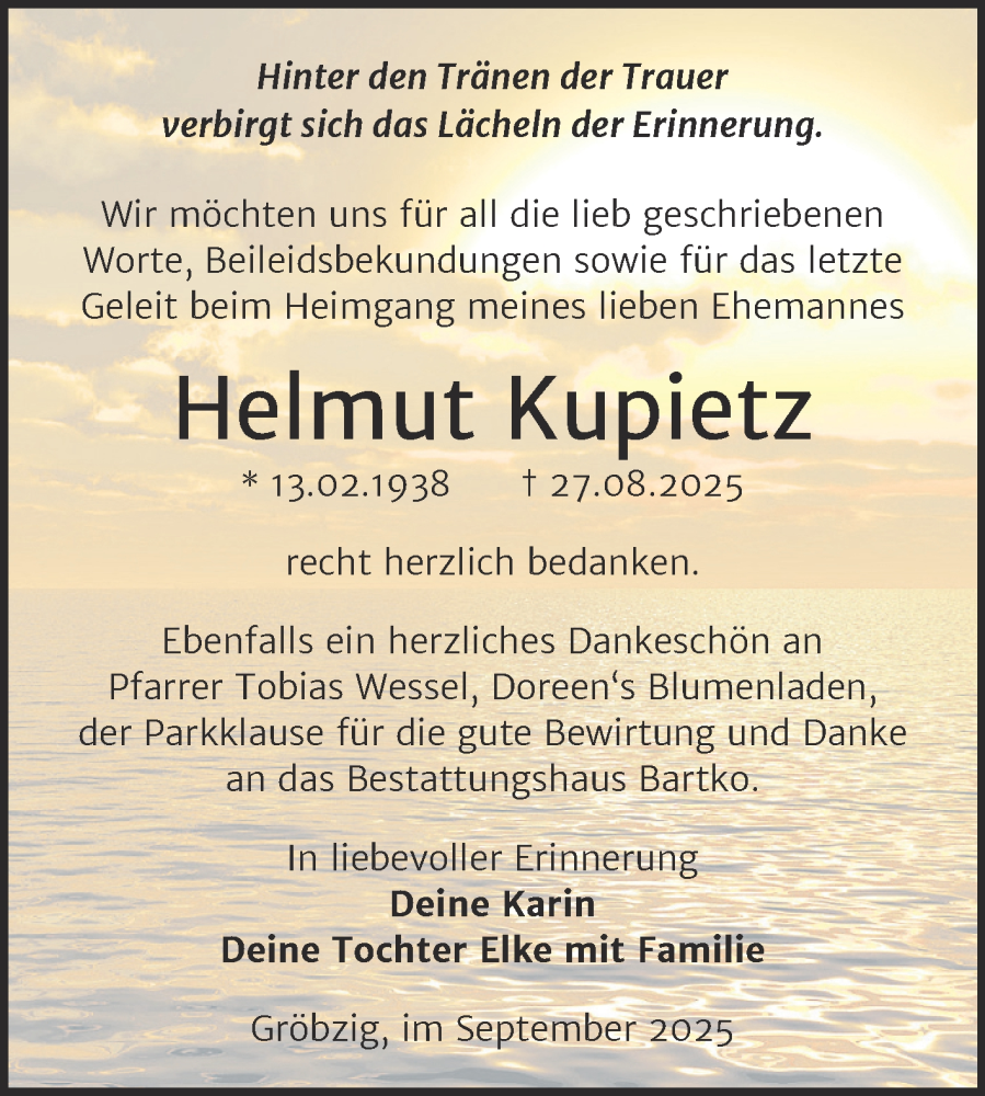 Hier finden Sie alle Traueranzeigen aus der Zeitung, die bisher für Helmut Kupietz erschienen sind. Weitere Traueranzeigen, die in der Zeitung erscheinen, werden hier ebenfalls aufgelistet