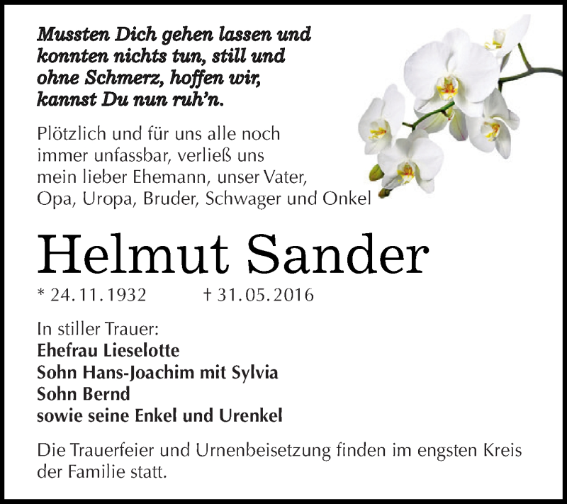 Hier finden Sie alle Traueranzeigen aus der Zeitung, die bisher für Helmut Sander erschienen sind. Weitere Traueranzeigen, die in der Zeitung erscheinen, werden hier ebenfalls aufgelistet