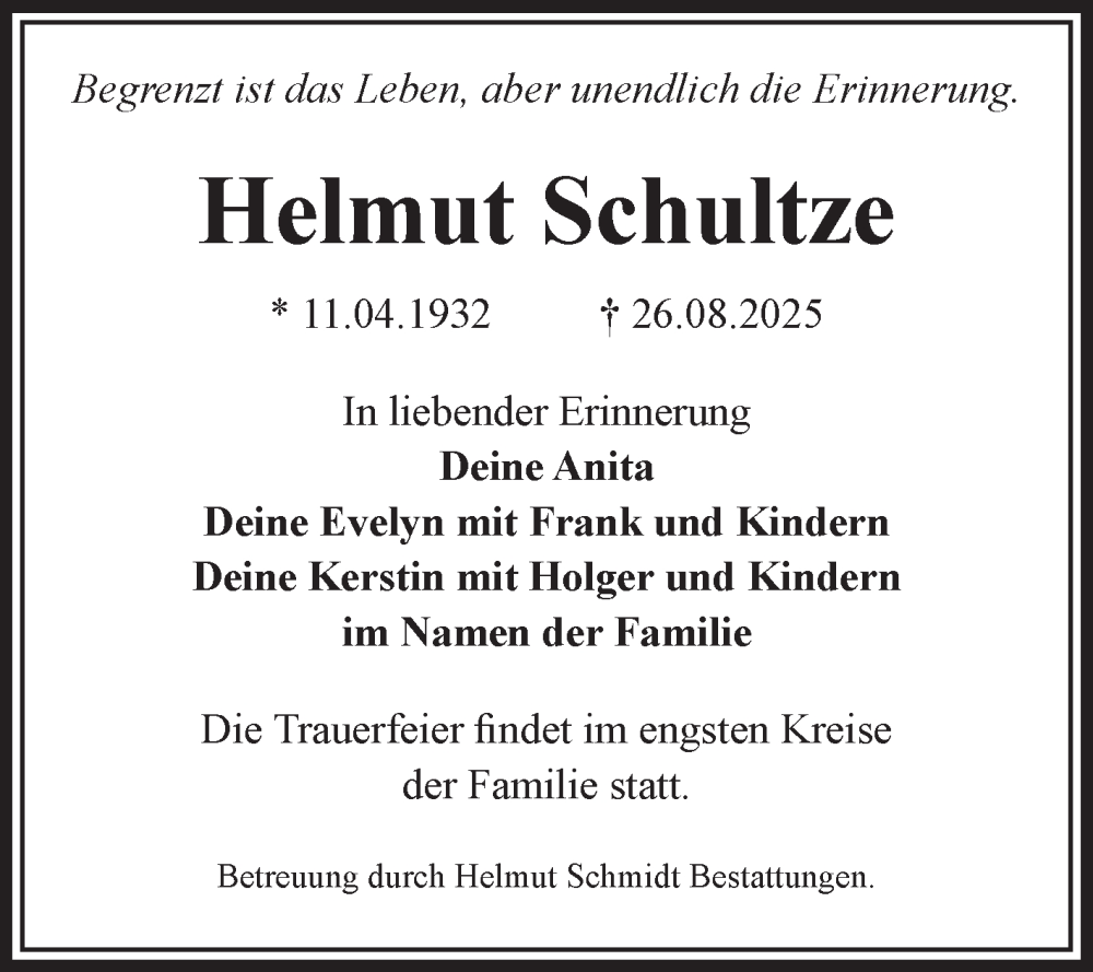 Hier finden Sie alle Traueranzeigen aus der Zeitung, die bisher für Helmut Schultze erschienen sind. Weitere Traueranzeigen, die in der Zeitung erscheinen, werden hier ebenfalls aufgelistet