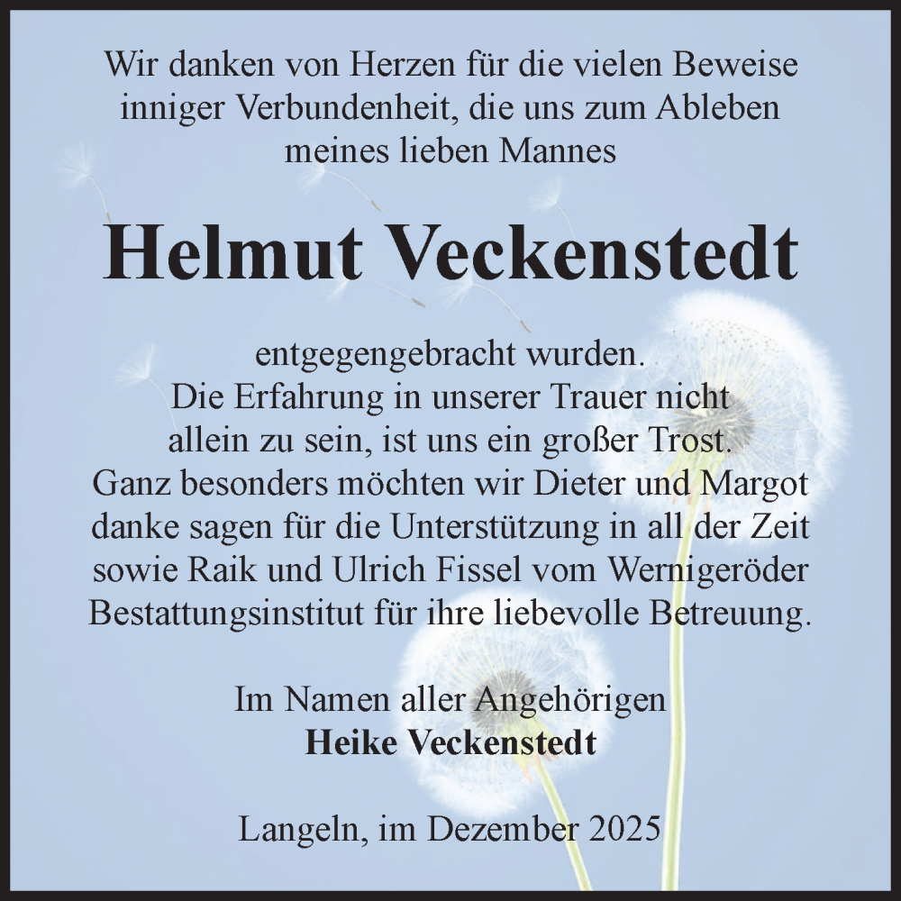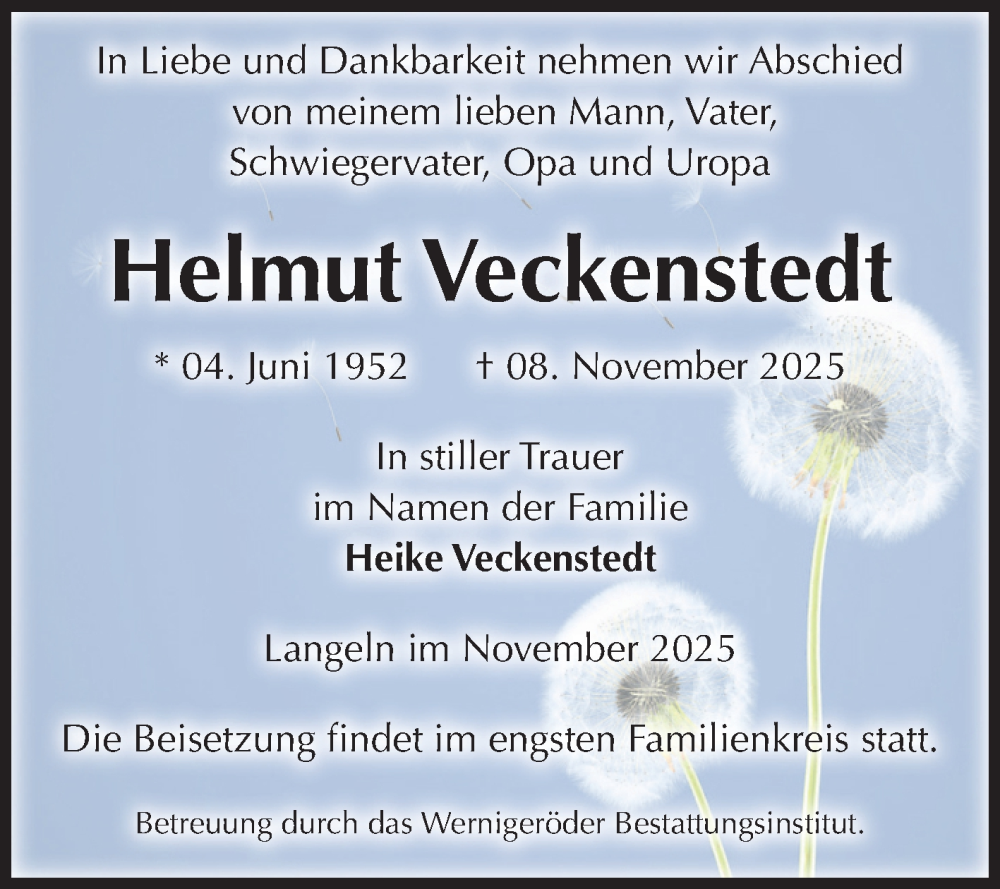Hier finden Sie alle Traueranzeigen aus der Zeitung, die bisher für Helmut Veckenstedt erschienen sind. Weitere Traueranzeigen, die in der Zeitung erscheinen, werden hier ebenfalls aufgelistet