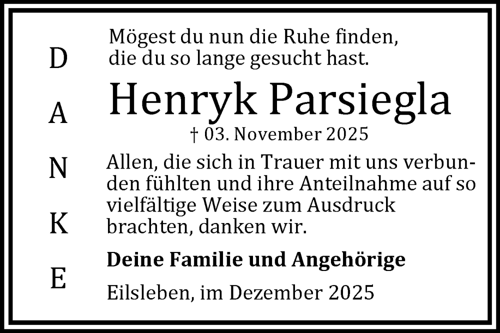 Hier finden Sie alle Traueranzeigen aus der Zeitung, die bisher für Henryk Parsiegla erschienen sind. Weitere Traueranzeigen, die in der Zeitung erscheinen, werden hier ebenfalls aufgelistet