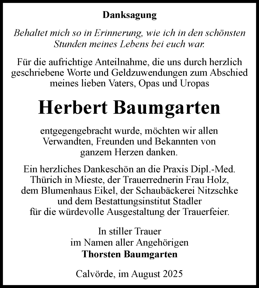 Hier finden Sie alle Traueranzeigen aus der Zeitung, die bisher für Herbert Baumgarten erschienen sind. Weitere Traueranzeigen, die in der Zeitung erscheinen, werden hier ebenfalls aufgelistet
