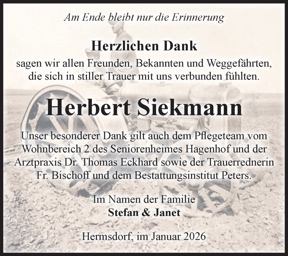 Hier finden Sie alle Traueranzeigen aus der Zeitung, die bisher für Herbert Siekmann erschienen sind. Weitere Traueranzeigen, die in der Zeitung erscheinen, werden hier ebenfalls aufgelistet