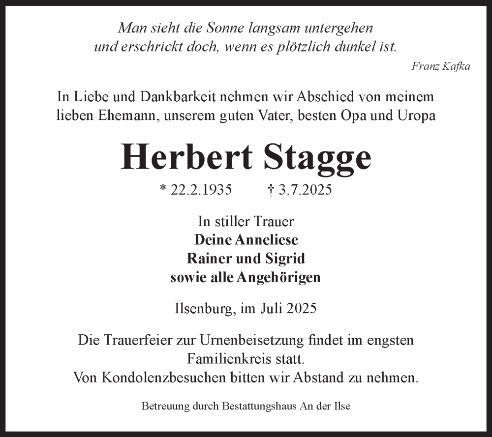 Hier finden Sie alle Traueranzeigen aus der Zeitung, die bisher für Herbert Stagge erschienen sind. Weitere Traueranzeigen, die in der Zeitung erscheinen, werden hier ebenfalls aufgelistet