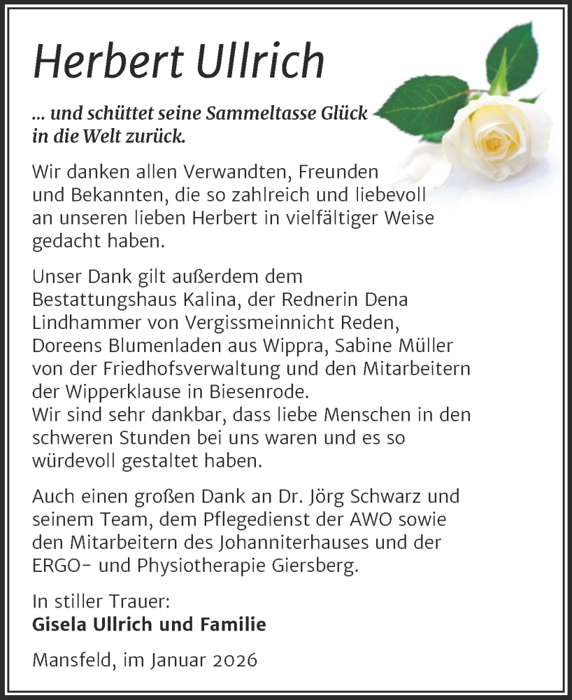 Hier finden Sie alle Traueranzeigen aus der Zeitung, die bisher für Herbert Ullrich erschienen sind. Weitere Traueranzeigen, die in der Zeitung erscheinen, werden hier ebenfalls aufgelistet