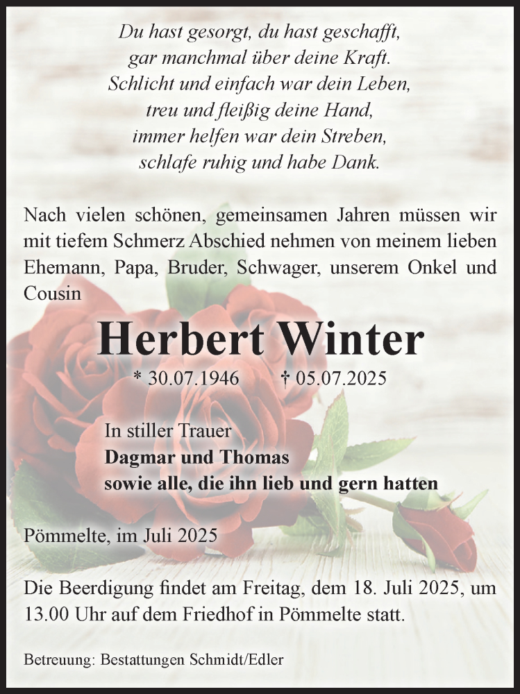 Hier finden Sie alle Traueranzeigen aus der Zeitung, die bisher für Herbert Winter erschienen sind. Weitere Traueranzeigen, die in der Zeitung erscheinen, werden hier ebenfalls aufgelistet