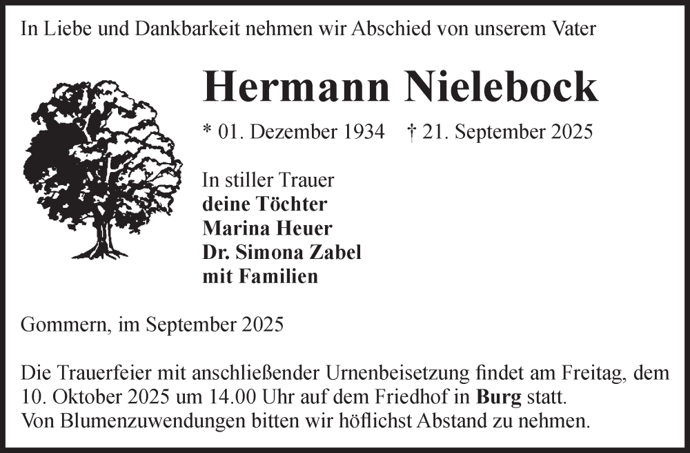Hier finden Sie alle Traueranzeigen aus der Zeitung, die bisher für Hermann Nielebock erschienen sind. Weitere Traueranzeigen, die in der Zeitung erscheinen, werden hier ebenfalls aufgelistet