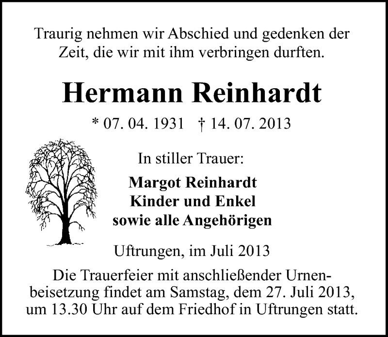 Hier finden Sie alle Traueranzeigen aus der Zeitung, die bisher für Hermann Reinhardt erschienen sind. Weitere Traueranzeigen, die in der Zeitung erscheinen, werden hier ebenfalls aufgelistet