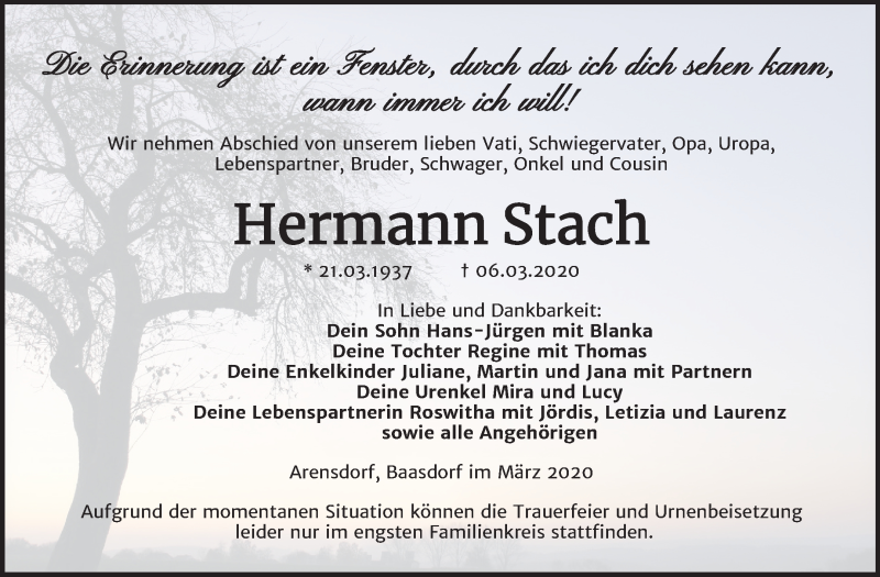 Hier finden Sie alle Traueranzeigen aus der Zeitung, die bisher für Hermann Stach erschienen sind. Weitere Traueranzeigen, die in der Zeitung erscheinen, werden hier ebenfalls aufgelistet