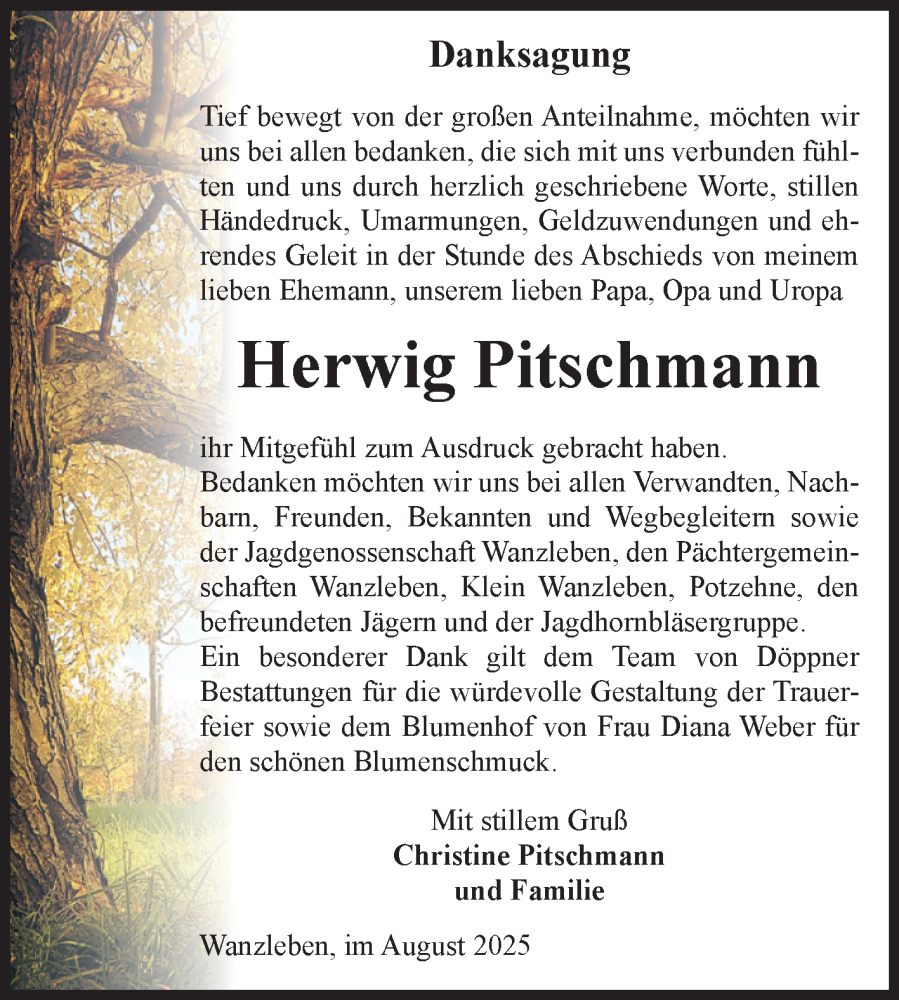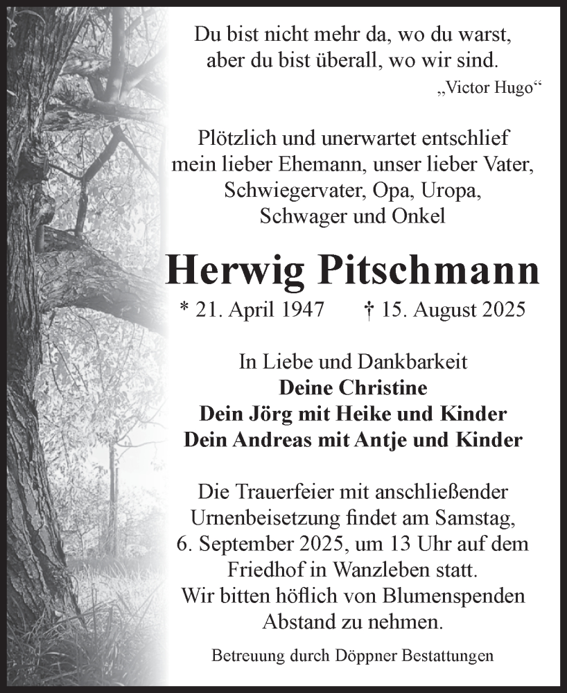 Hier finden Sie alle Traueranzeigen aus der Zeitung, die bisher für Herwig Pitschmann erschienen sind. Weitere Traueranzeigen, die in der Zeitung erscheinen, werden hier ebenfalls aufgelistet