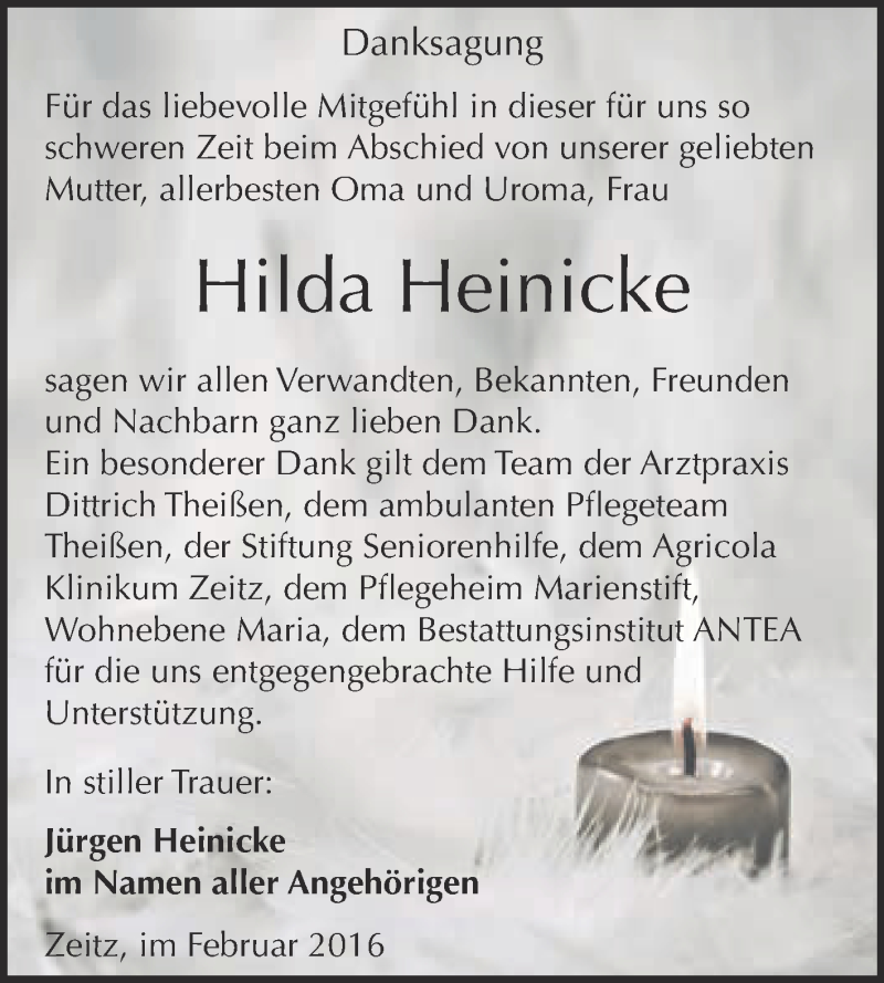 Hier finden Sie alle Traueranzeigen aus der Zeitung, die bisher für Hilda Heinicke erschienen sind. Weitere Traueranzeigen, die in der Zeitung erscheinen, werden hier ebenfalls aufgelistet