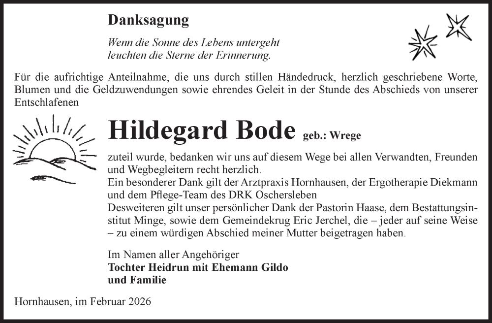 Hier finden Sie alle Traueranzeigen aus der Zeitung, die bisher für Hildegard Bode erschienen sind. Weitere Traueranzeigen, die in der Zeitung erscheinen, werden hier ebenfalls aufgelistet