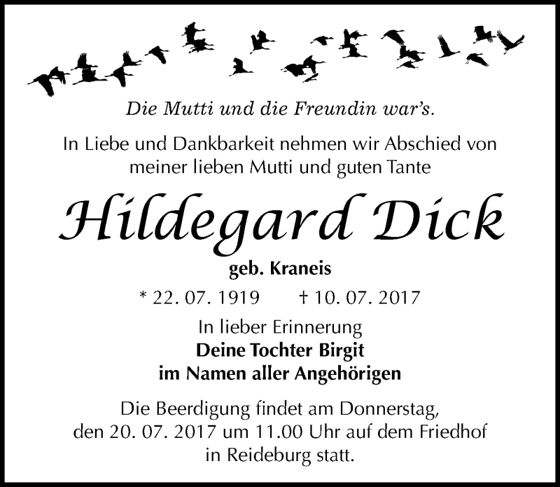 Hier finden Sie alle Traueranzeigen aus der Zeitung, die bisher für Hildegard Dick erschienen sind. Weitere Traueranzeigen, die in der Zeitung erscheinen, werden hier ebenfalls aufgelistet