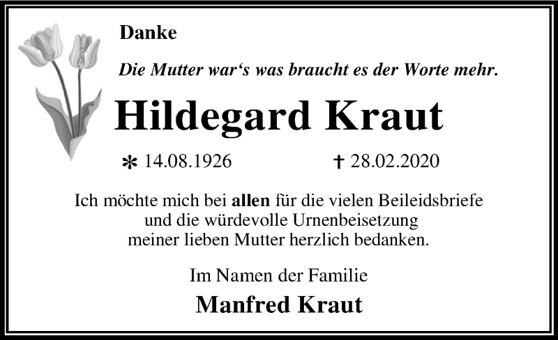 Hier finden Sie alle Traueranzeigen aus der Zeitung, die bisher für Hildegard Kraut erschienen sind. Weitere Traueranzeigen, die in der Zeitung erscheinen, werden hier ebenfalls aufgelistet