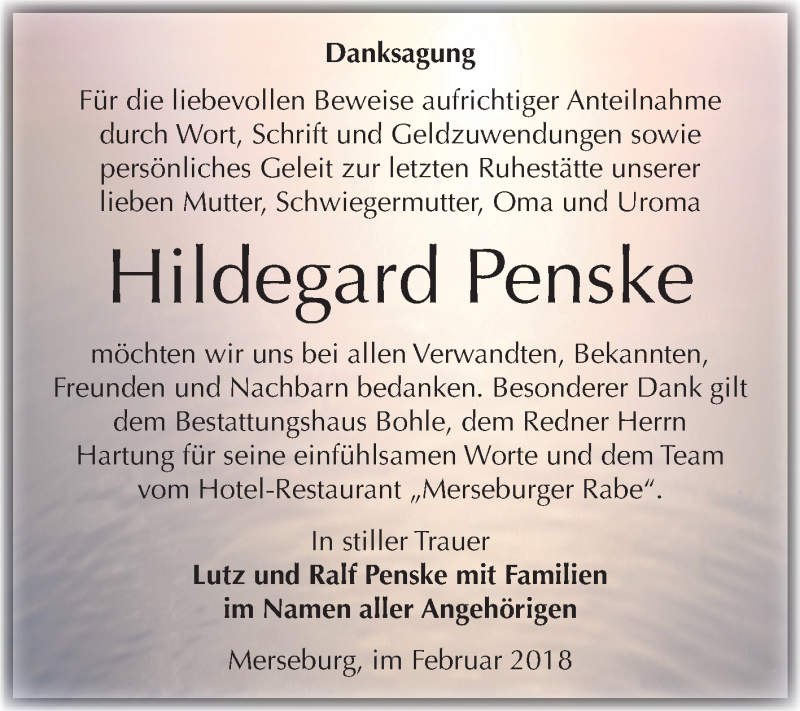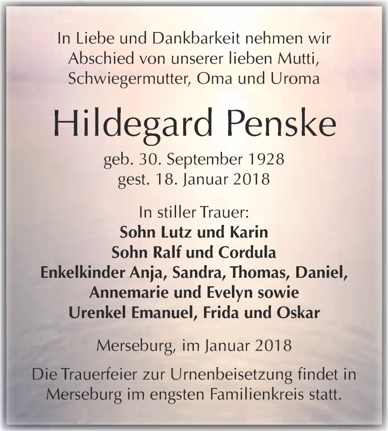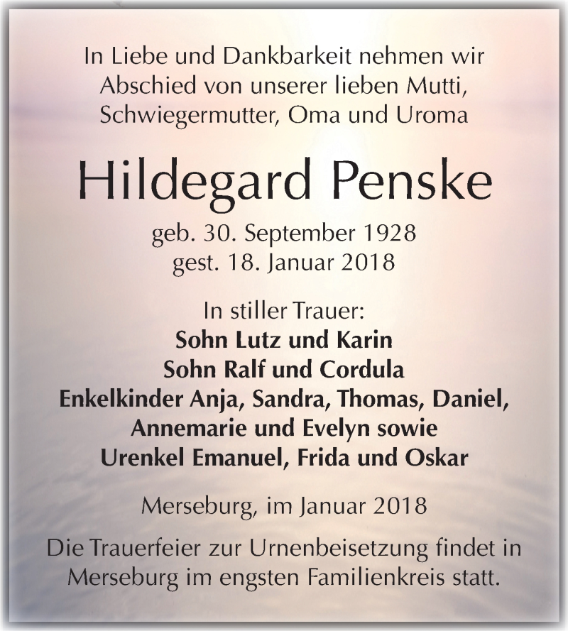 Hier finden Sie alle Traueranzeigen aus der Zeitung, die bisher für Hildegard Penske erschienen sind. Weitere Traueranzeigen, die in der Zeitung erscheinen, werden hier ebenfalls aufgelistet