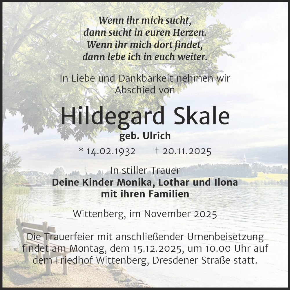 Hier finden Sie alle Traueranzeigen aus der Zeitung, die bisher für Hildegard Skale erschienen sind. Weitere Traueranzeigen, die in der Zeitung erscheinen, werden hier ebenfalls aufgelistet