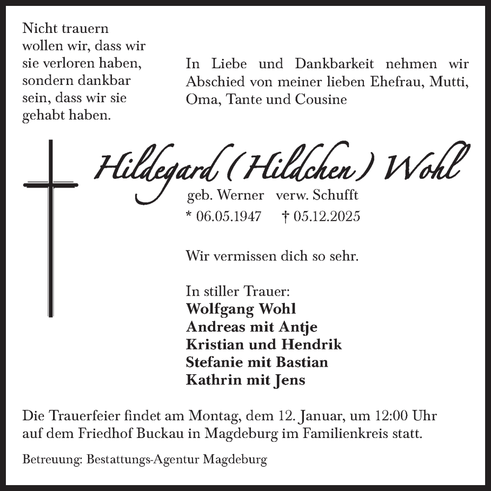 Hier finden Sie alle Traueranzeigen aus der Zeitung, die bisher für Hildegard Wohl erschienen sind. Weitere Traueranzeigen, die in der Zeitung erscheinen, werden hier ebenfalls aufgelistet