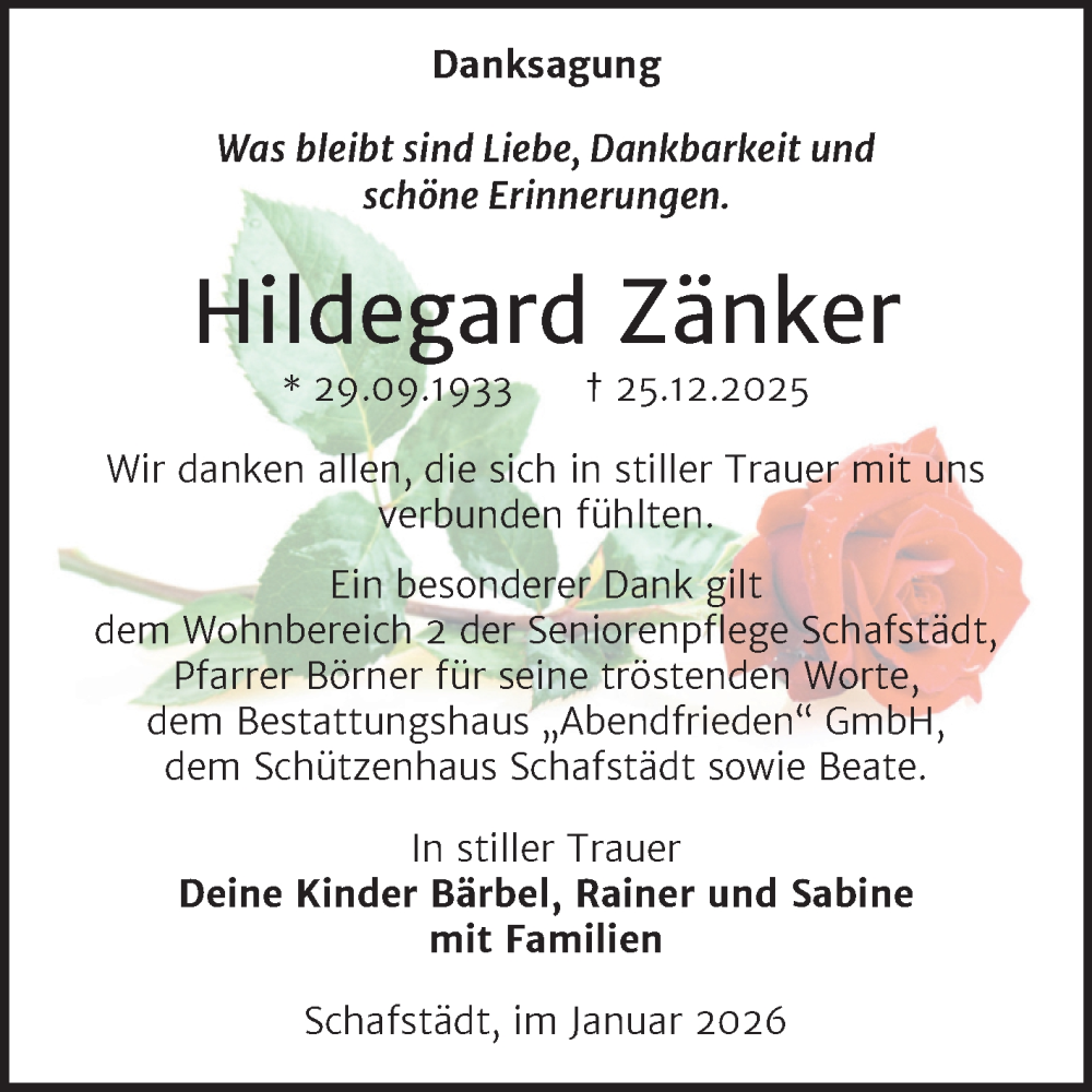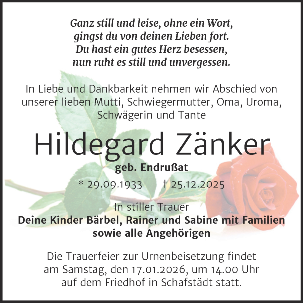 Hier finden Sie alle Traueranzeigen aus der Zeitung, die bisher für Hildegard Zänker erschienen sind. Weitere Traueranzeigen, die in der Zeitung erscheinen, werden hier ebenfalls aufgelistet