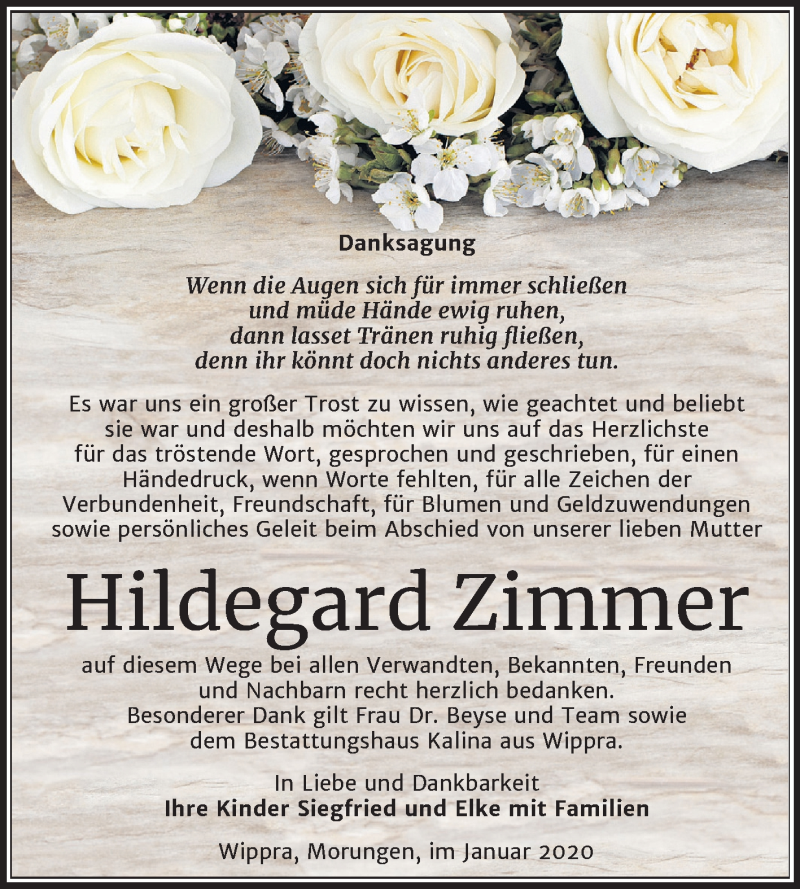 Hier finden Sie alle Traueranzeigen aus der Zeitung, die bisher für Hildegard Zimmer erschienen sind. Weitere Traueranzeigen, die in der Zeitung erscheinen, werden hier ebenfalls aufgelistet