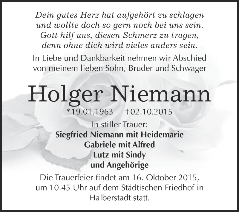 Hier finden Sie alle Traueranzeigen aus der Zeitung, die bisher für Holger Niemann erschienen sind. Weitere Traueranzeigen, die in der Zeitung erscheinen, werden hier ebenfalls aufgelistet